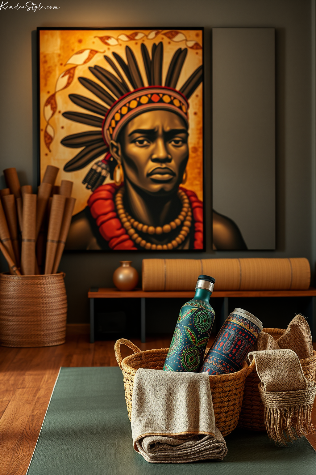 Stay motivated with a home gym featuring bright colors, African-inspired artwork, natural light, plants, and organized storage for equipment.