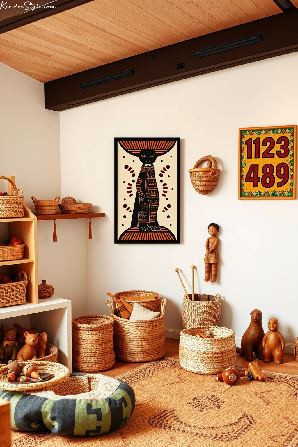 Welcome baby with a nursery featuring colorful African-inspired prints, natural wood furniture, soft textiles, plenty of storage in woven baskets, and gentle lighting.