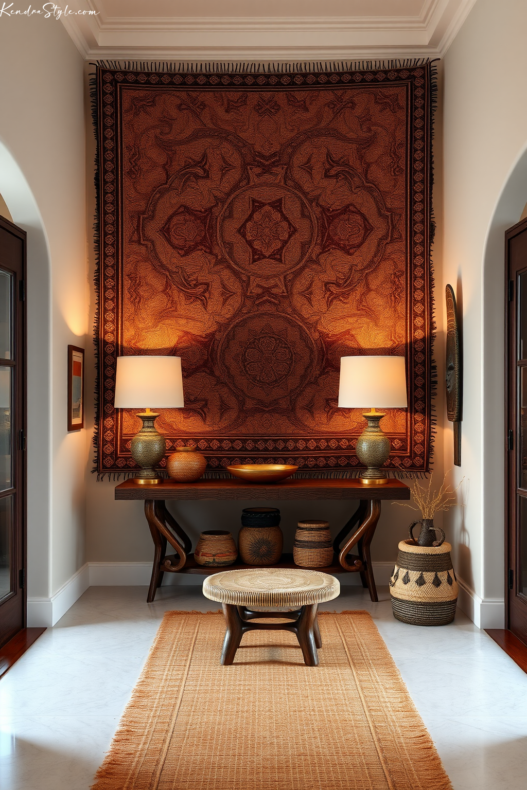 Make a memorable first impression with an entryway featuring a statement mirror, console table with African pottery, hooks for coats, and a colorful rug.