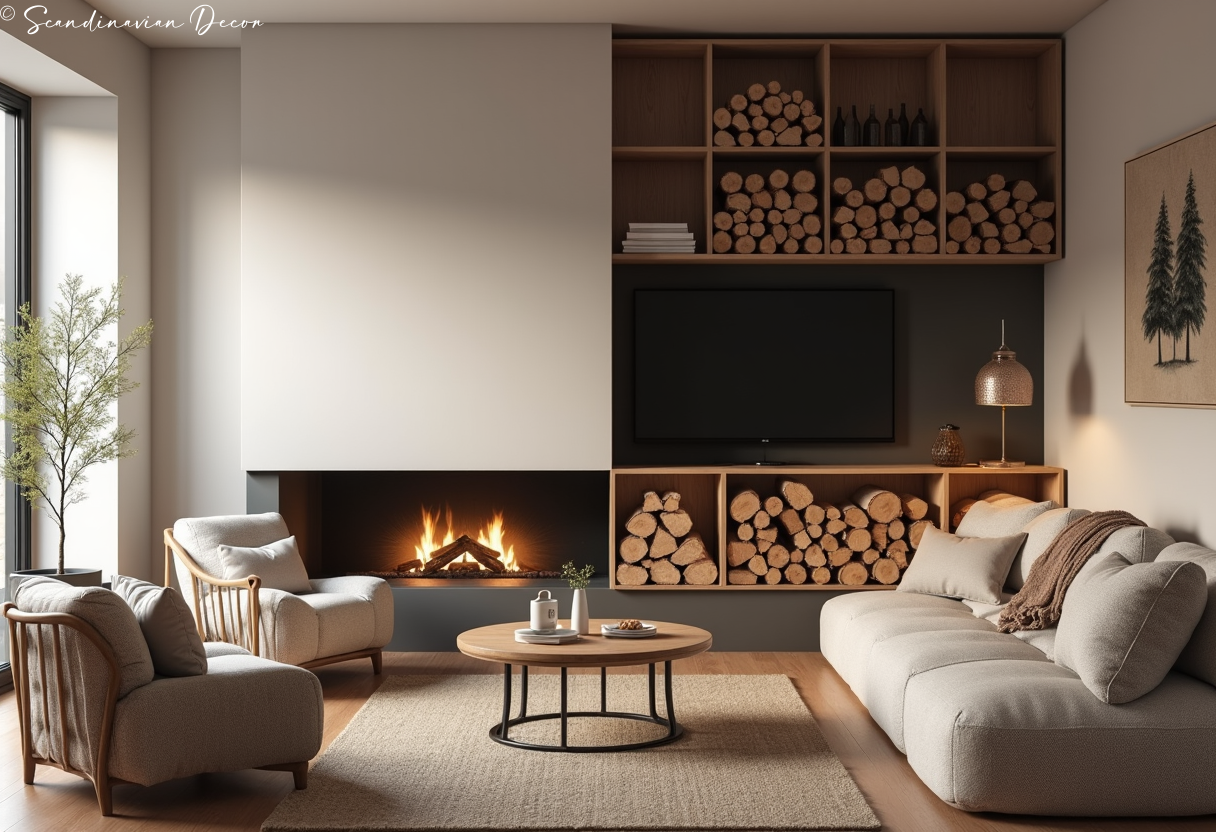 A cozy fireplace corner demonstrates hygge at its finest. Wood accents and soft textiles create warmth while maintaining the clean aesthetic that defines Nordic design.