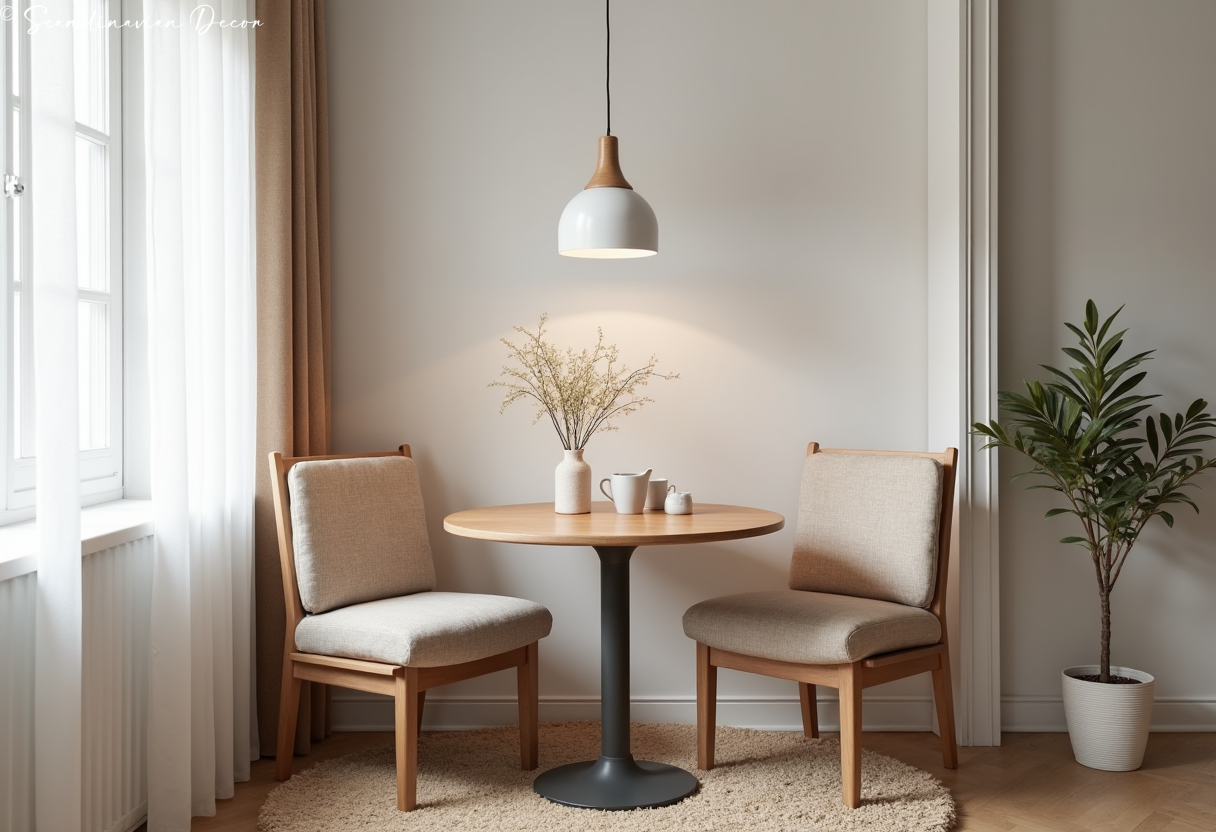 Cozy dining nook with round table creates intimate meal settings. The simple chairs and minimal styling make the space feel open and inviting.