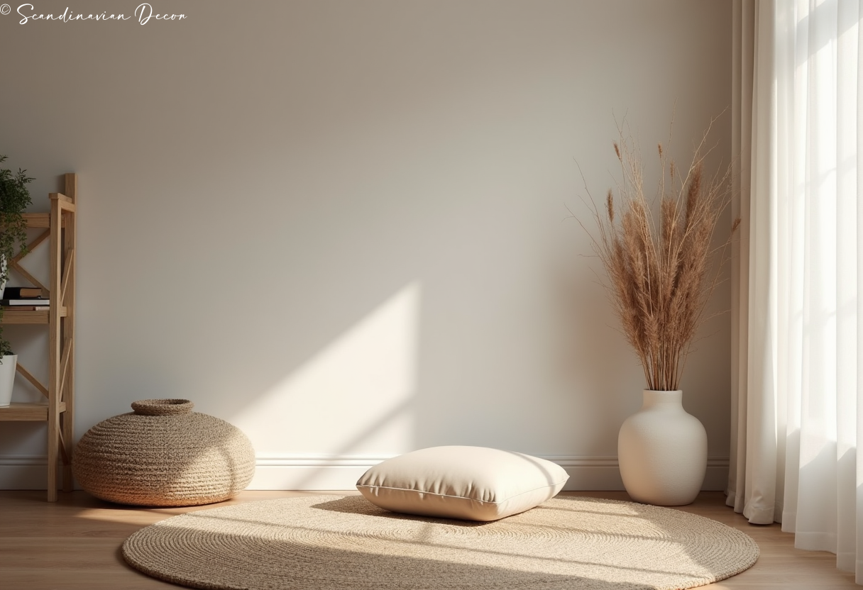 Peaceful meditation corner with floor cushion and minimal decor. This serene space supports mindfulness practice.
