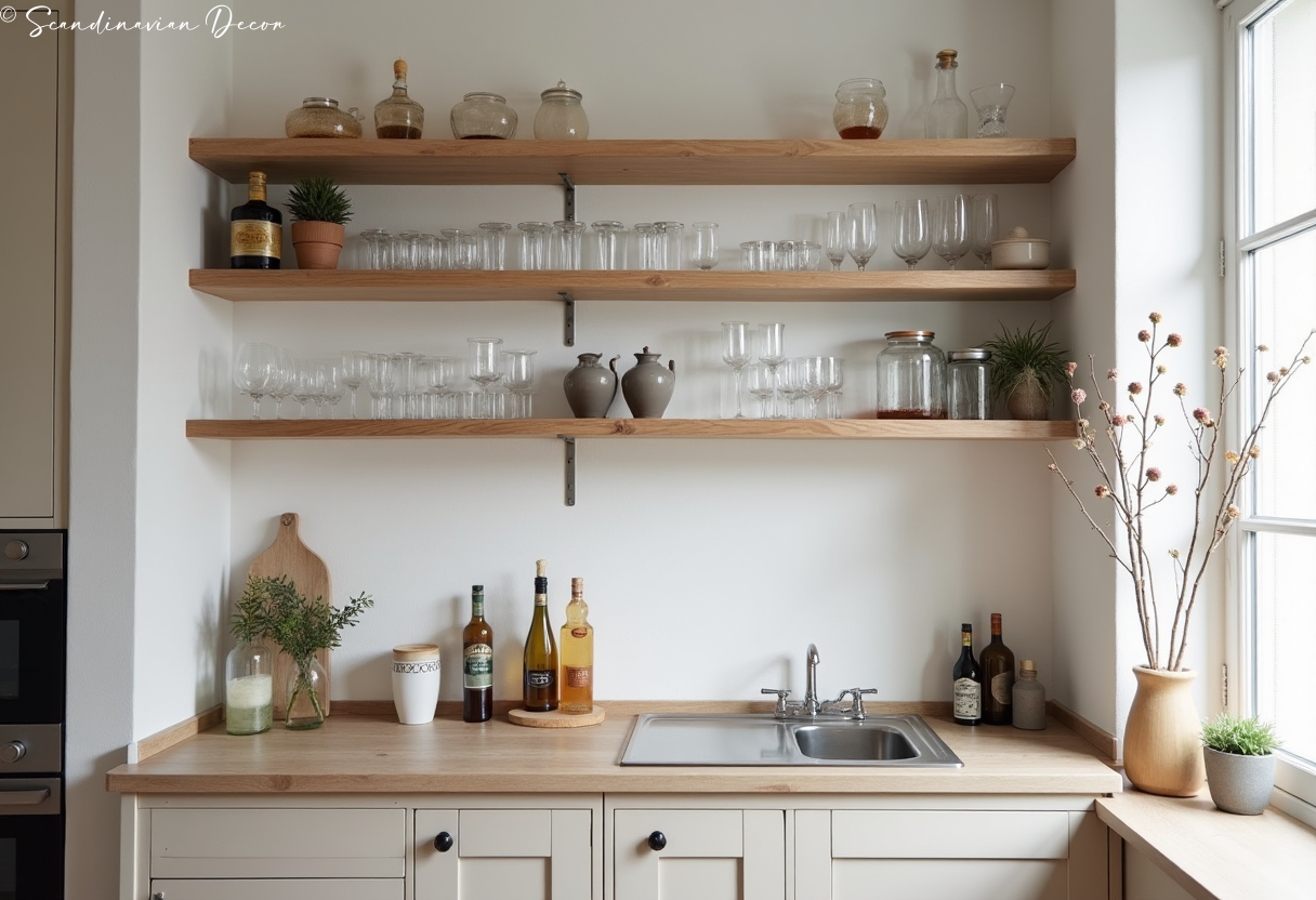 Floating shelves display glassware beautifully. This minimal bar setup maintains the clean aesthetic while providing entertaining function.