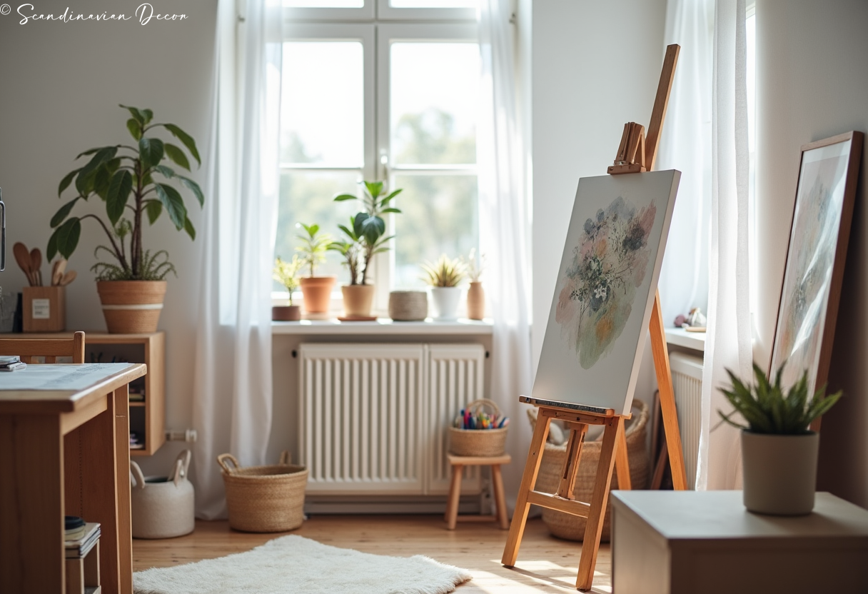 Natural light floods this art studio with easel. The simple setup focuses attention on creativity rather than clutter.
