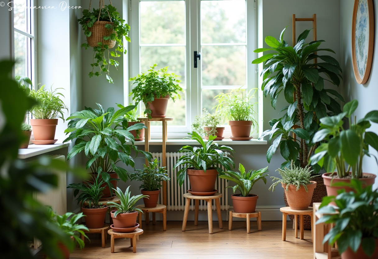 Multiple plants arranged on wooden stands bring nature indoors. This green corner adds life and oxygen while maintaining the natural aesthetic.