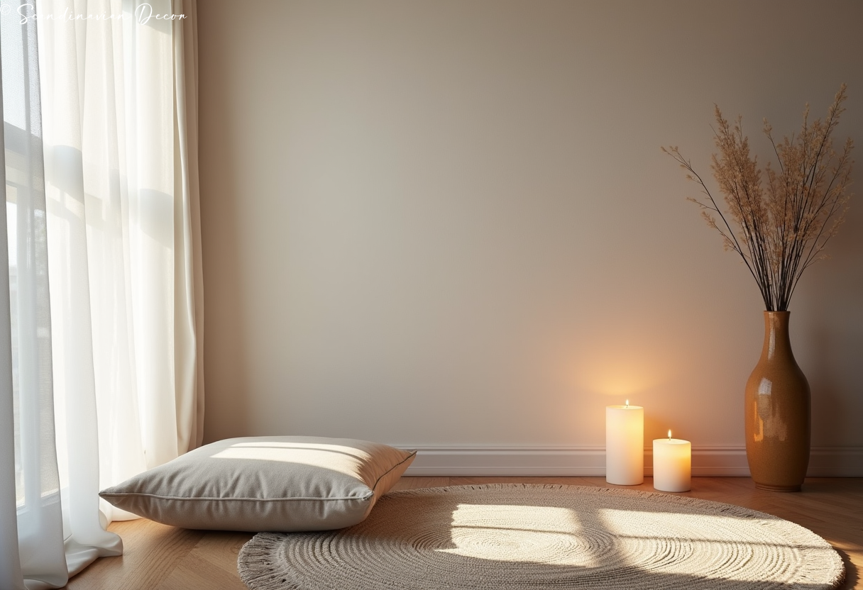 Simple meditation corner with floor cushion and candles creates sacred space. This peaceful retreat supports daily mindfulness practice.