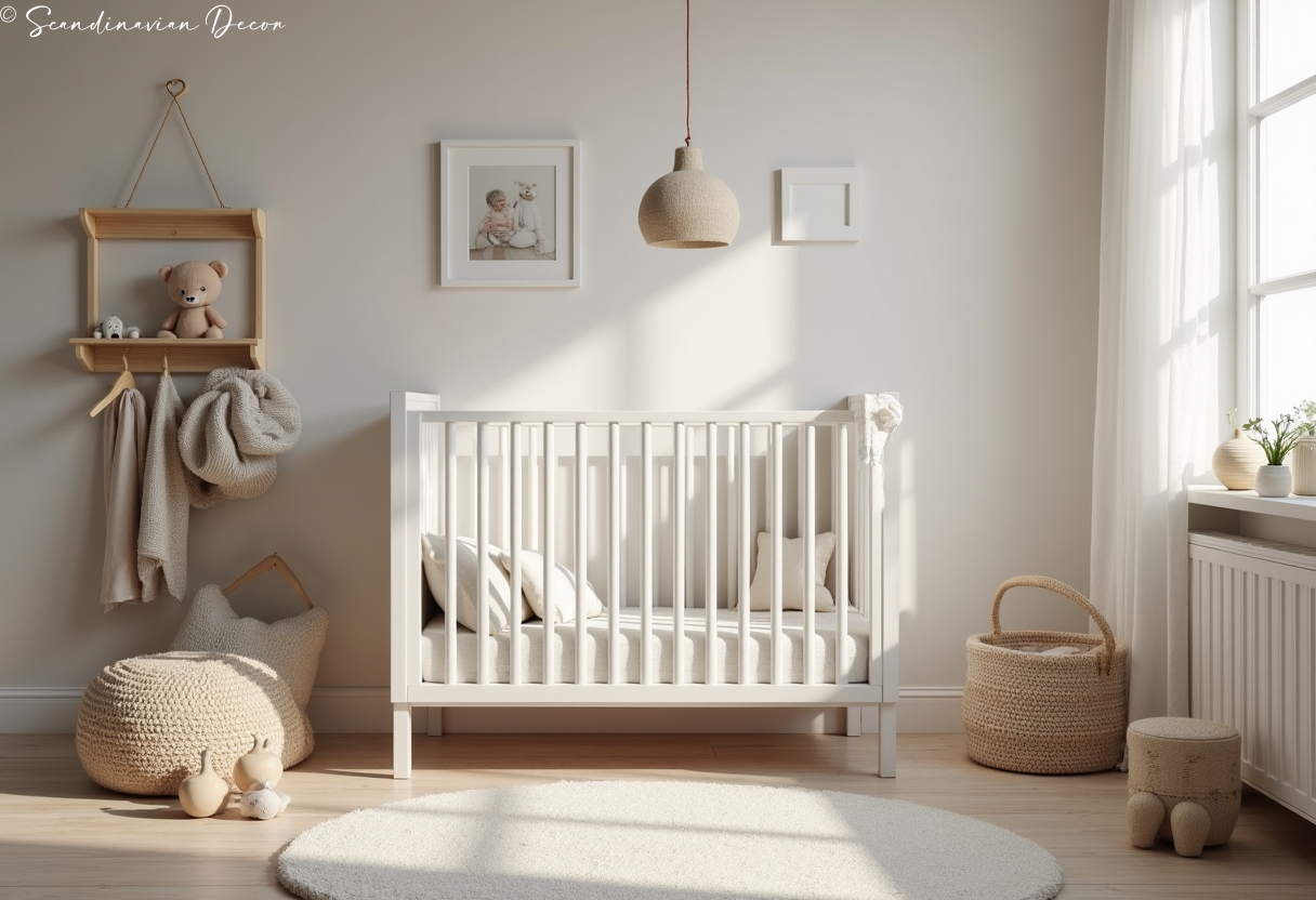 Peaceful nursery design with white crib and soft textiles creates a calm environment for baby. Natural materials and gentle colors promote restful sleep.